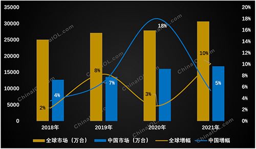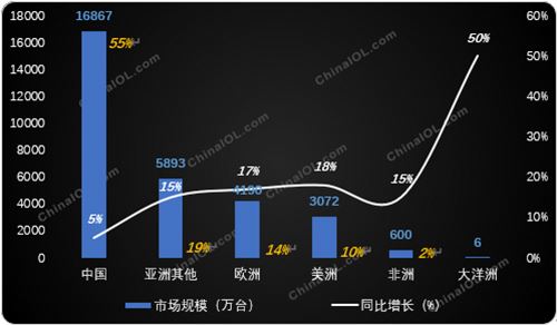 從區(qū)域增長來看,2021年全球各區(qū)域隨著疫情的控制以及制造業(yè)的恢復(fù),市場均實(shí)現(xiàn)正向增長,其中中國由于市場體量較大,占比達(dá)到55%,不過隨著全球制造業(yè)的恢復(fù),在前期高增長基礎(chǔ)上出現(xiàn)了大幅回落。而亞洲其他、歐洲、美洲和非洲等區(qū)域由于2020年的同期基數(shù)低,2021年均實(shí)現(xiàn)了10%以上的增長。