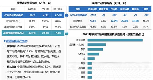 從區(qū)域供需特點(diǎn)來看,以歐洲市場為例,2021年歐洲總體市場規(guī)模4190萬臺,同比增長17%,在全球市場的份額為13.7%。產(chǎn)品方面以冰箱冷柜為主,占比75.3%,2021年冰箱冷柜、飲水機(jī)、車載冰箱和除濕機(jī)均實(shí)現(xiàn)10%以上的增長。