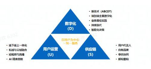 所以數字化之于實體零售企業,是對于自身運營模式、組織流程的再造,是貫穿于前中后臺每個環節的價值重塑,需要對實體零售行業有著深刻的理解和認知,多點DMALL合伙人任中偉結合7年來多點DMALL服務零售企業數字化轉型的經驗,總結了“數字化時代零售企業DUS能力模型”(D數字化,U用戶運營,S供應鏈),在他看來,未來零售企業要獲得持續制勝,首先要回歸零售行業的本質,即以用戶為中心,一對一的服務,同時需要建立用戶運營(user operation)、供應鏈(supply)、數字化(digitization)三大能力,缺一不可。