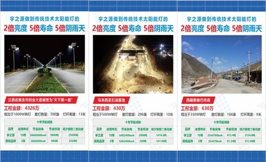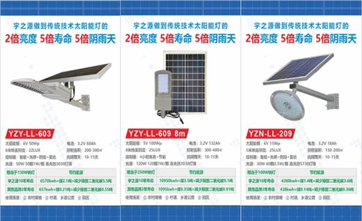 據統計,我國戶外照明產品需求超過30億盞,如果用太陽能照明產品替代以上市場的80%以上照明產品,每年節省的用電量所減少的碳排放高達十億噸以上。但太陽能照明行業“亮度不夠、抗陰雨天時間短、使用壽命短”三大問題一直困擾著市場替代更換。宇之源太陽能照明產品運用獲得國家發明金獎的省電80%的技術創新,著力解決了行業三大痛點,實現了同等配置普通技術產品的2倍亮度、5倍陰雨天、5倍使用壽命,使產品具備滿足用戶視覺需求、全年正常亮燈、使用壽命達10年以上、性價比高、節能減排效果好等優勢。