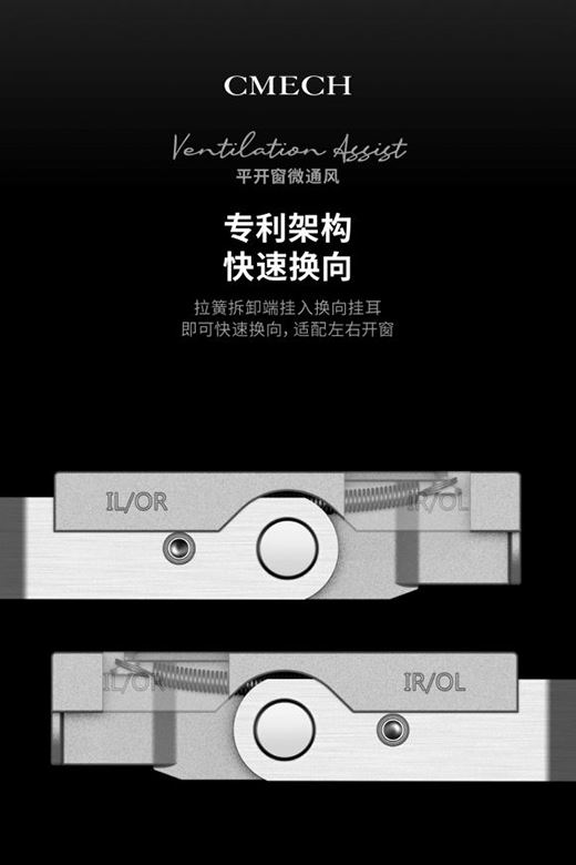 同時,這款平開窗微通風門窗五金組件設有專利架構,拉簧拆卸端掛入換向掛耳,可快速換向,適配左右開窗。并且可有效限制窗框的開啟角度,即解決了因天氣和環境影響下不能有效通風的困擾,又保證開窗時的安全性。