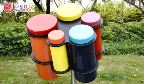 笛馳精英鼓系列形態各異,或是彩虹色的圓弧型設計,或是如同盛開的巨大花朵,斑斕的色彩使其富有視覺沖擊力,陽光有活力,不銹鋼材質打造的鼓身可以承受戶外惡劣天氣的考驗,內置共鳴,音色飽和,拍打時會形成一種高亢的氛圍,讓人忍不住的舞動起來。