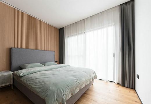主臥選用原木色地面搭配平面吊頂與無主燈設計,視覺空間擴大一倍,床體選擇高級灰,漂亮時尚又百搭,床頭墻面做柵格式的設計,溫馨又高級,窗臺是半高全面窗搭配雙色窗簾,采光好又能確保房間隱私,功能性十足。
