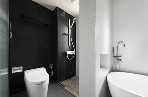 衛生間做干濕分離設計,地面是灰色瓷磚設計,墻面則是根據不同的區域做雙色設計,馬桶與淋浴間做黑色瓷磚設計,浴缸做白色瓷磚設計,兩色拼接,衛生間大氣簡潔。