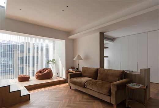 客廳選用原木兩色的面板拼接做地面,屋頂做簡潔白的平面吊頂搭配無主燈設計,讓房屋的視覺空間擴大一倍,搭配與原木地板同色系的絨面沙發,陽臺做高十公分窗面做全面鏡,放置一個懶人沙發在窗臺,舒適感十足。
