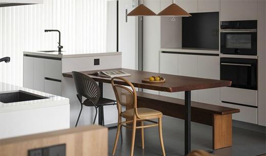 餐廳與開放式廚房在同一個空間,地面以灰色瓷磚做設計,搭配原木長方形餐桌面,一側是相對兩色的餐椅,另一側則是長面凳,餐桌旁設計導臺,兩側分別做設計,一側是廚房,另一側則是櫥柜與烤箱的搭配,讓屋主在有限的空間做無限的規劃。