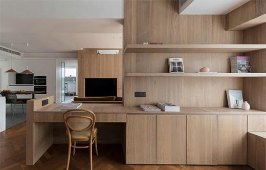 書桌設計在客廳位置,全部利用原木做設計,地面是原木面板拼接,搭配原木制成的書架與書桌,50公分開闊視野,右側靠近窗臺位置是開放式收納柜,臺面式的收納柜美觀又能放置大件,隱藏式收納柜確保隱私。