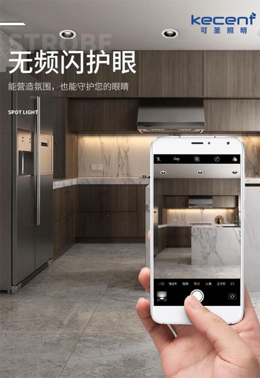 如若我們細心觀察KECENT可圣照明在銷的各款產品的詳情頁,一定會發現每個產品都帶有“無頻閃”的介紹,這些產品明亮舒適,不晃眼,更適合安裝于家中。