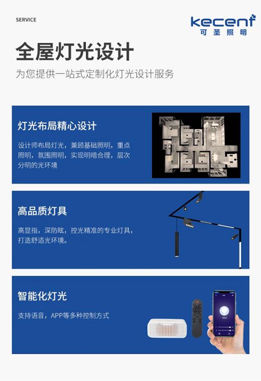像KECENT可圣照明,便兼有提供高品質燈具及一站式定制化全屋燈光設計兩種核心服務。如上文提到的防眩、防頻閃,及結合防藍光、高顯色指數、低光衰、壽命長等優勢的無主燈燈具產品,在KECENT可圣照明商城皆可購買到。而在燈光設計服務方面,KECENT可圣照明擁有一支成熟的燈光設計師團隊,憑借專業的燈光設計經驗在家居基礎照明、重點照明、氛圍照明的設計上精準發力,實現獨具一格的燈光方案;同時用心融合用戶的個性化審美需求,致力為廣大客戶家庭提供“我家燈光我做主”的健康優質家居燈光環境。