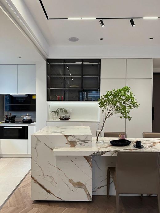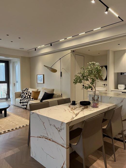 整體空間采取現代極簡風的基調,以凈白的墻面與木質感的地板組合,搭配上極具層次感的無主燈設計與簡約大方的家具軟裝,為我們呈現出一種愜意自然的舒適氛圍感。
