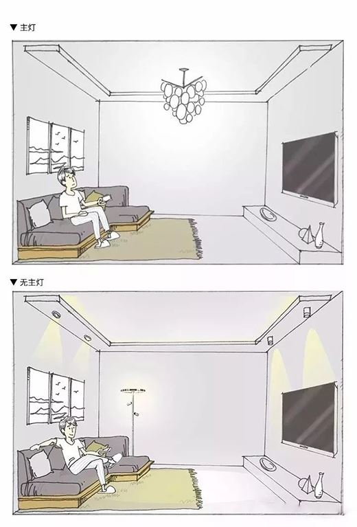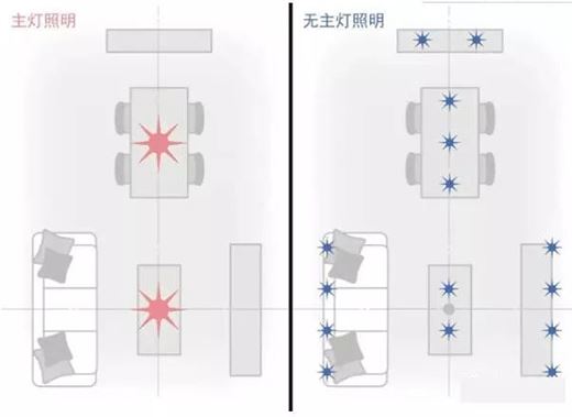 看到這里,估計還有小伙伴還沒弄明白什么是「無主燈照明」呢。簡單一點來說,主燈照明就是利用一到兩盞吸頂燈、造型燈來奠定整體照明的基礎(下圖左)。無主燈照明則是以點狀分部在天花板的小筒燈來代替主燈(下圖右)