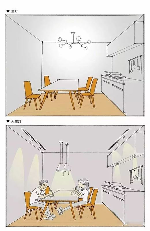 ▲有主燈餐廳幾乎可以做到無死角照明,但無法對局部進行強調(diào),無主燈餐廳,每個部位可根據(jù)需要進行燈光設計,實現(xiàn)多種生活場景融合,餐桌吊燈能突出用餐區(qū),促進食欲,櫥柜射燈突出照亮操作區(qū),避免人擋住頂燈照明帶來的死角。