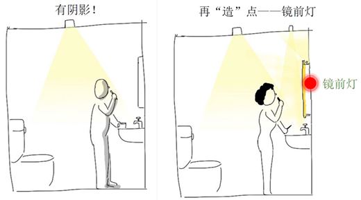 對于衛(wèi)生間照明,很多家庭就在頂部安裝了一個主燈,由于投光原理,很多邊角位置有陰影,比如洗漱臺的化妝鏡最好安裝局部的燈帶或者筒燈來補光。