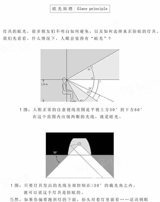 眩光簡單的來說就是會刺眼的光線,會讓人感覺到不舒服的光線,就算是再深防眩光的射燈,在射燈正下方也一樣會有眩光,在設計燈光的時候,所有射燈的光線都要經(jīng)過設計,不能直射。