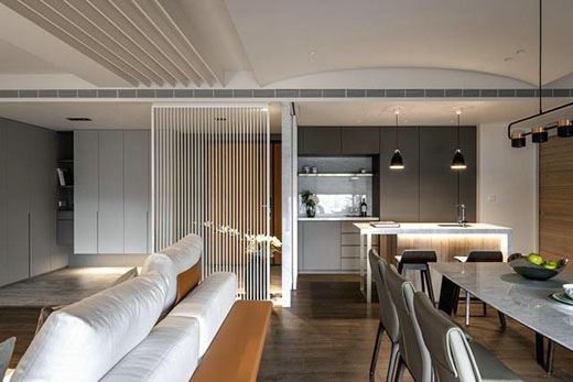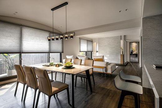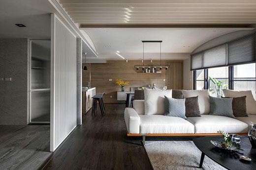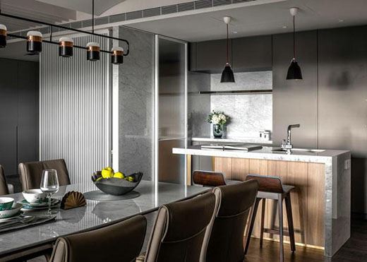 客廳連接的是餐廚一體式的開放空間,讓整個家居的使用變得利落了起來。暗黑色的木質(zhì)地板與低調(diào)簡單的魚肚大理石墻面形成鮮明對比,落地式的三扇窗戶讓空間透亮起來。