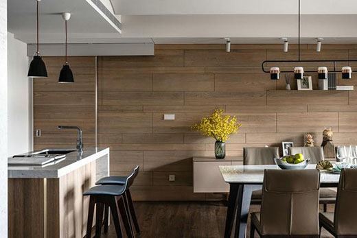 與廚房銜接的高雅小餐廳,墻面也是拼接的木紋色,餐廳的墻面上設(shè)置了柜子,可以放一些酒和雜物,安裝的筒式射燈以及裝飾品的搭配也讓用餐環(huán)境變得優(yōu)雅起來。