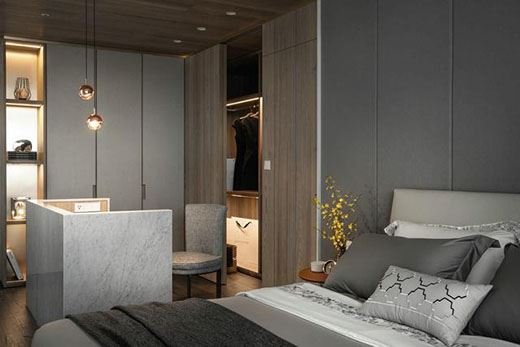 臥室是比較私密以及放松休閑的環(huán)境,所以也是使用了無主燈的設(shè)計搭配。衣帽間的筒燈序列,工作區(qū)的聚焦吊燈,睡眠區(qū)的床頭燈,讓臥室通透了起來。