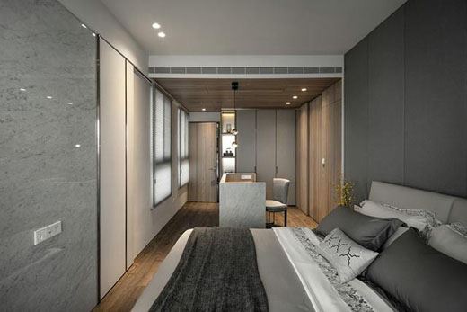再來看看臥室的環(huán)境,這個角度看過去拉伸感很強(qiáng)烈,衣帽間與臥室用了簡單的隔斷,衣柜部分做的是封閉式柜子,私密性更佳,如果男同胞們不善于收拾衣柜,那這小門一關(guān),誰也看不見。中間做了類似小吧臺的平面桌,可以為主人增加放置物品的空間,也可以學(xué)習(xí)以及工作的環(huán)境,衣柜顏色與地板的深色搭配起來非常的舒適,搭配和諧、不突兀。
