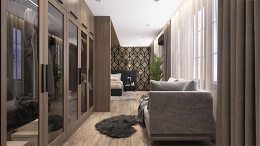臥室與更衣室相連,更衣室使用雙開玻璃推拉門連接,這種推拉門帶來(lái)的效果和落地玻璃窗類似,柜門采用淺棕色的色調(diào),再次和整體形成統(tǒng)一。