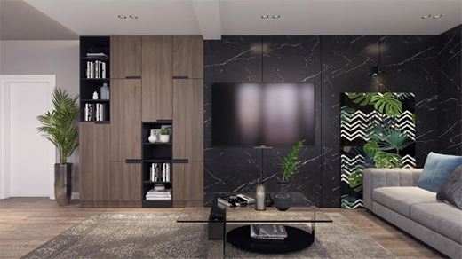 客廳吊頂采用白色乳膠漆進(jìn)行通刷設(shè)計(jì),讓頂部看起來(lái)更為整潔美觀,整體采用無(wú)主燈的設(shè)計(jì),讓客廳上下更為敞亮。整個(gè)客廳是一個(gè)矩形的大通透空間,在沙發(fā)側(cè)邊采用圓形筒燈作為補(bǔ)光設(shè)施,黑色的電視背景墻邊是陳列柜,這是一處客廳設(shè)計(jì)亮點(diǎn),框架感讓客廳更具時(shí)尚性。
