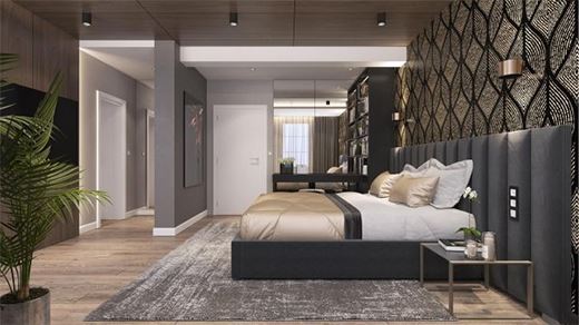 作為休息空間,臥室的床頭背景墻一整面都使用工藝飾面板進(jìn)行裝飾,利用裝飾花紋紋理和質(zhì)感奠定了空間輕松、大氣和奢華的基調(diào)。