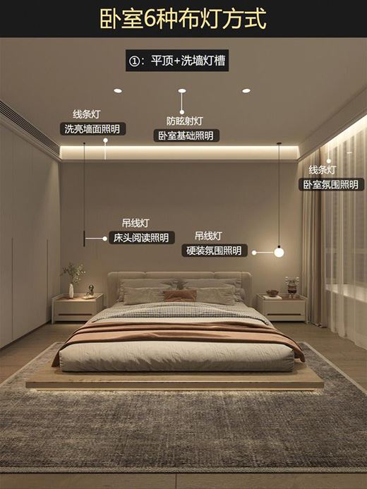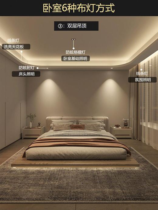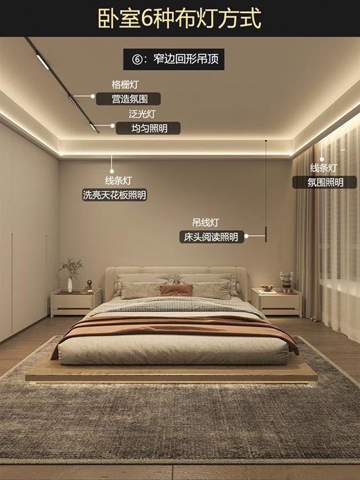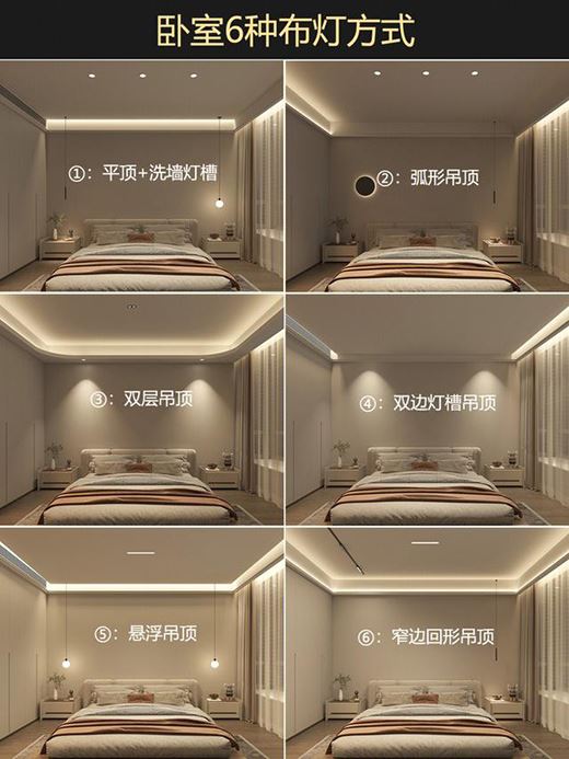 臥室六種布燈方式分享,不同吊頂的布燈方式會有不同,視覺感也會有不同: