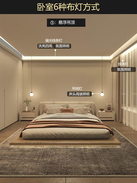 做邊吊造型,安裝線條燈,增加設計感;超薄磁吸軌道燈做氛圍照明和均勻照明,床頭吊線燈閱讀作用。