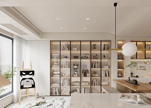 墻面定制裝飾柜,靠窗位置設計白色柜門,其余柜門采用玻璃材質裝飾出定制的高級感,同時又展示出柜體里裝飾品的精美。