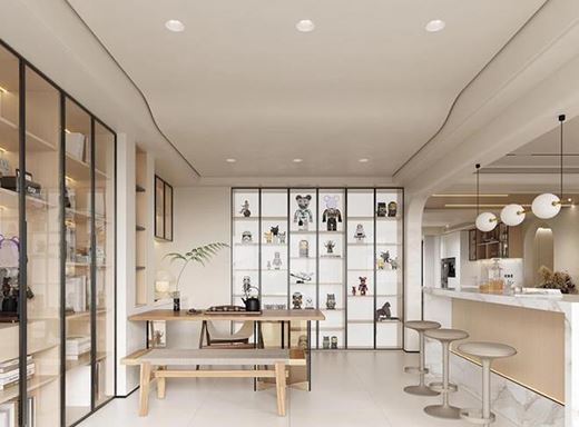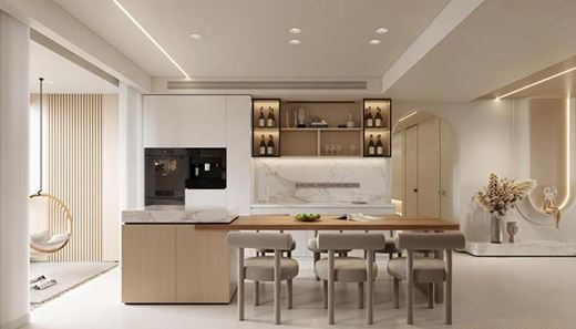 奶油風的餐廳,往往會帶著幾分侘寂風的感覺,木質餐桌與珊瑚絨的餐椅相搭配,質感溫馨舒適。餐邊的設計,加上隱形燈帶增加餐廳柔和。