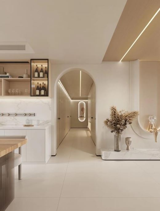 在硬裝上通過打造圓弧型門洞,在過道設計嵌入式燈帶。