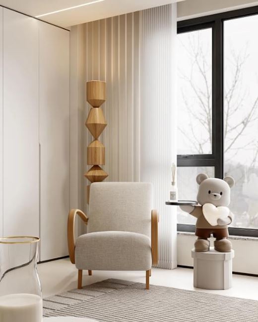 在沙發材質上選擇質感柔和的珊瑚絨,給人舒適、溫馨的感覺。在沙發旁搭配一個可愛的裝飾品,打造輕松自在的空間氛圍。
