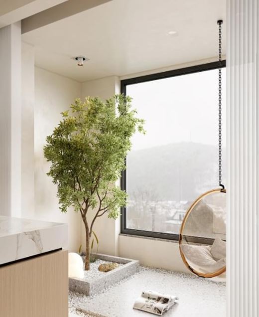 餐廳靠窗位置設計一個吊椅,進行休閑、閱讀、觀賞風景。