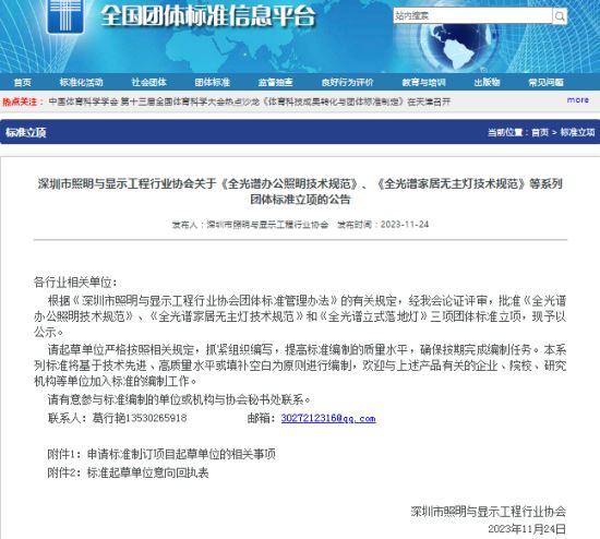 深圳市照明與顯示工程行業協會經過組織調研,結合目前應用較為廣泛和需求較為迫切的幾類場景,根據《深圳市照明與顯示工程行業協會團體標準管理辦法》的有關規定,批準立項《全光譜辦公照明技術規范》、《全光譜家居無主燈技術規范》和《全光譜立式落地燈》三項團體標準。目前,上述三項團體標準已在全國團體標準信息平臺上正式向社會公眾進行公告。