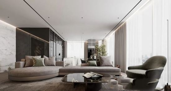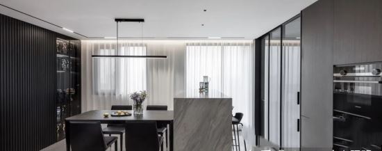 別墅作為會客的場所,是客人對于屋主的第一印象,通透的燈光更能打造大氣的空間質感,體現屋主對高格調的追求。善于運用線形燈具,如燈槽、鋁條線形燈或磁吸軌道燈等,填補天花或墻面的留白,提供均勻的環境光,再用射燈照亮茶幾、餐桌、擺件等,提供重點照明,擦亮墻面、窗簾,提供立面照明。