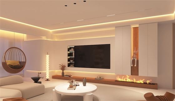 在傳統的照明設計中,大型的主燈往往會占據視覺中心,限制了空間的延展性。而無主燈設計則通過隱藏或分散光源,使得天花板和墻面變得更加簡潔和干凈,從而在視覺上拓展了空間感。這樣的設計不僅讓客廳顯得更加寬敞,也為室內裝飾提供了更多的發揮空間。