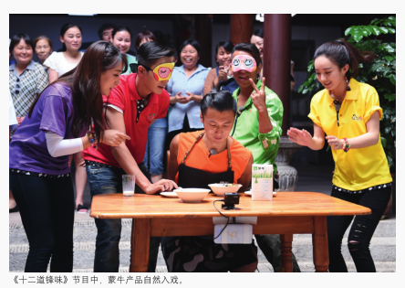在《十二道鋒味2》節目中,蒙牛花了非常多的心思和努力去設計品牌的植入。“我們想得很深、很多,希望整個品牌的露出更加的軟化,希望是從一種文化的角度去植入,而不是簡單的只是一個品牌的露出。所以為了讓植入更生動,我們為節目定制了一系列周邊道具,”陳顥對記者說。