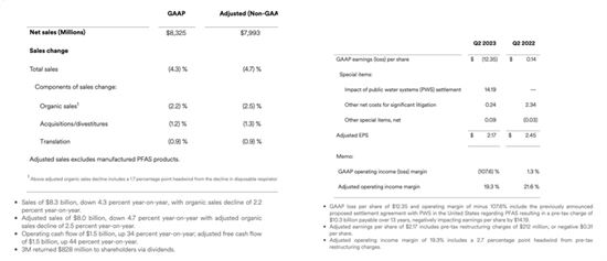 3M醫療虧損巨大高達68.41億美元,合每股12.35美元,在第二季度銷售中差額83.25億美元。損失包括3M與美國公共供水系統提出的為期13年,約103億美元的協議解約違約金,用于測試和清理所謂的“永久化學品”——全氟烷基和多氟烷基物質,即PFAS。除了PFAS訴訟,3M也涉及與現任和前任服務人員的訴訟調解,尋求數十億美元以減輕據稱耳塞缺陷造成的聽力損失。