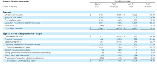 賽默飛公布了自己家的第二季度財政營收為106.9億美元,比去年同期109.7億美元下降3%,核心有機收入增長2%。主要業務板塊有生命科學解決方案、分析儀器、特殊診斷業務、實驗室產品和生物制藥服務