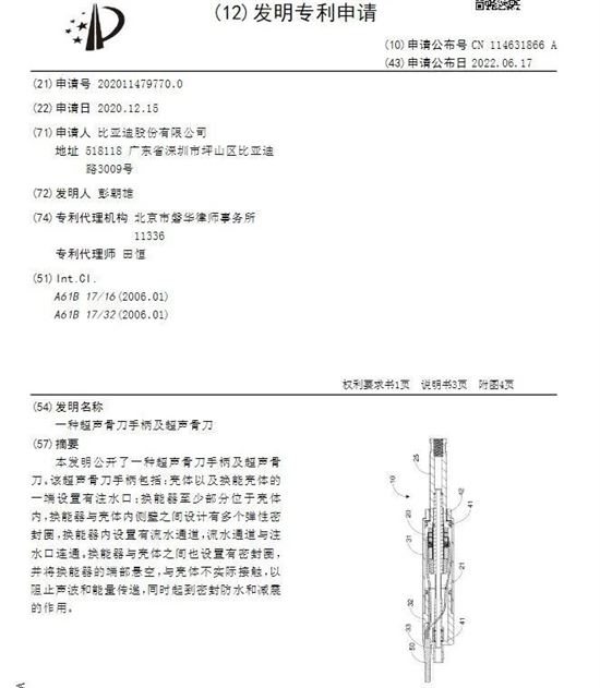 而比亞迪所公布超聲骨刀的專利顯示,其重新設計了超聲骨刀的換能器,改善了骨刀的握感,還完成了使用陶瓷代替鈦合金刀頭的實驗。