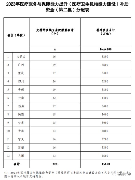2023年醫療服務與保障能力提升(醫療衛生機構能力建設)補助資金(第二批)分配表顯示,該項資金補助將用于全國13地的228家鄉鎮衛生院,平均每家將獲得200萬的補助資金,合計4.56億。分別為:內蒙古、廣西、重慶、四川、貴州、云南、西藏、陜西、甘肅、青海、寧夏、新疆及生產建設兵團。明細如下: