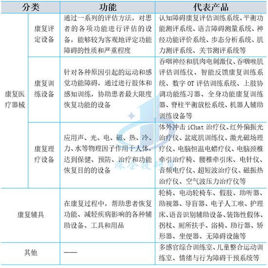 按作用機理分,康復器械主要產品涵蓋聲療、光療、電療、磁療、中醫類、壓力療法、運動訓練(PT)、作業訓練(OT)等。按照作用方式的不同,又可分康復理療設備(物理治療設備)、康復訓練設備、康復評定設備等。廣義的康復器械還包括康復輔具等,如下表所示。