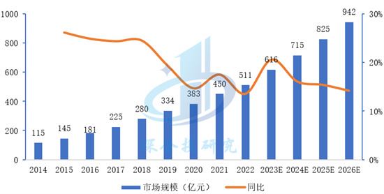 我國康復醫療器械市場規模持續擴大。根據Frost&Sullivan數據,2022年中國康復醫療器械市場規模為511億元,預計2026年達到941.5億元。