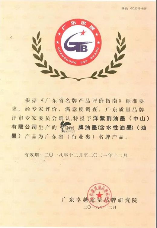 此次獲評為「廣東省名牌產品」肯定洋紫荊油墨在各方面表現,代表洋紫荊油墨在產品質量及知名度、品牌建設、市場占有率、質量管理、生產規模及技術等方面均在行業中處于領先地位。未來,洋紫荊油墨將繼續致力為消費者提供優質的產品及服務!