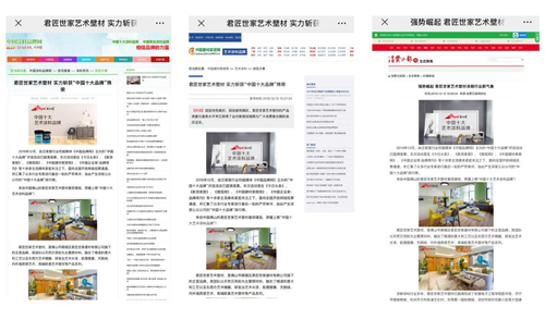 經過全國消費者和行業專家的積極參與,君匠世家藝術壁材在多個維度的綜合考核中脫穎而出,榮耀入選“中國十大藝術涂料品牌”排行榜,由此品牌美譽度在全國人們心中獲得大幅度提升。2020年4月,籌備已久的品牌廣告片在CCTV-1、CCTV-7兩大黃金頻道持續展播,再一次讓全國大眾見識到君匠世家的實力和魅力,憑借權威央視媒體推廣力量的輔助和口碑效應的發散,這對聯手經銷商促進終端銷售起著重要作用。