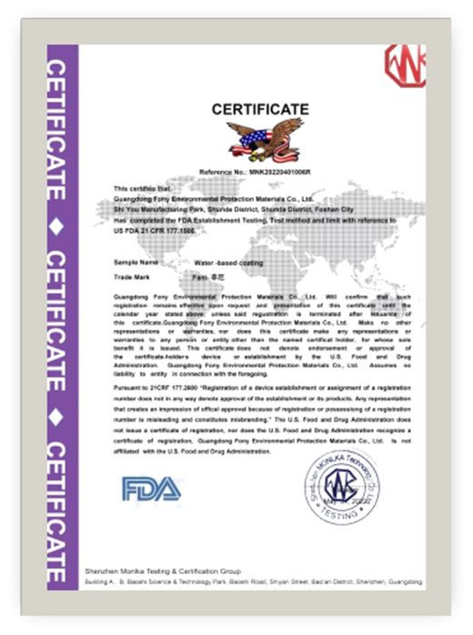 FDA是美國(guó)食品藥物管理局,是在國(guó)際上醫(yī)療審核的權(quán)威機(jī)構(gòu)之一,通過(guò)FDA認(rèn)證的食品、藥品、化妝品和醫(yī)療器具對(duì)人體是確保安全而有效的,而且FDA審核進(jìn)口商品過(guò)程是非常嚴(yán)苛的,F(xiàn)DA對(duì)產(chǎn)品的審核有一套完整的認(rèn)證程序以確保產(chǎn)品的安全性能,菲尼藝術(shù)涂料通過(guò)美國(guó)FDA認(rèn)證,標(biāo)志著產(chǎn)品技術(shù)、安全性格符合FDA對(duì)食品藥品檢測(cè)標(biāo)準(zhǔn),在產(chǎn)品安全方面已達(dá)到國(guó)際先進(jìn)水平。