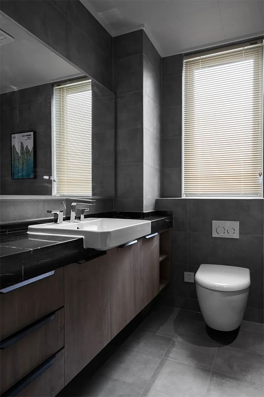 ▲另一個衛生間也是采取同樣的灰色瓷磚+灰木色浴室柜設計,不同的布局也搭配出了類似的空間氛圍。