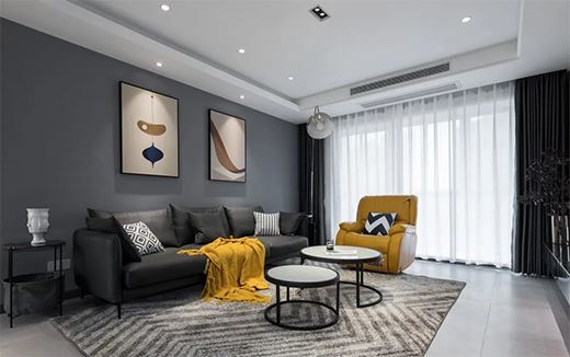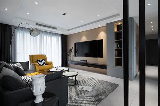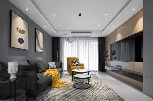 ▲客廳現代風的基礎,天花采取無主燈的吊平頂設計,灰色沙發墻與布藝沙發、地毯等軟裝,電視墻這是木質感定制的設計,加入黃色皮沙發椅與毯子,帶來一種簡約而又有活力的空間氣息。