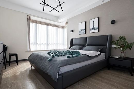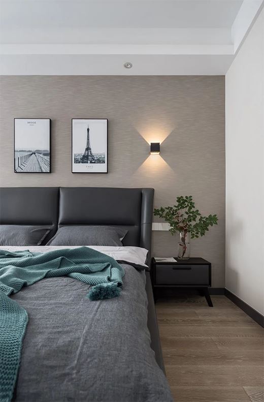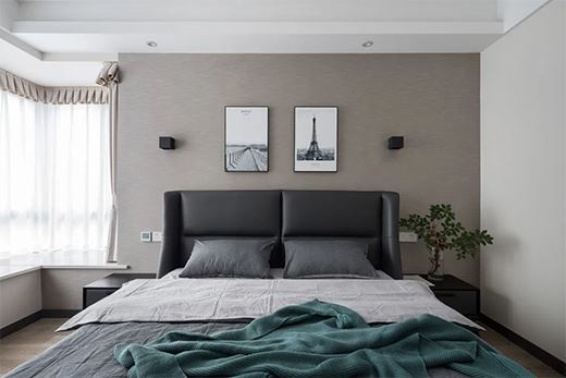▲咖灰色調的床頭墻上,掛上兩幅黑白調的裝飾畫,左右側黑色床頭柜上裝著黑色小壁燈,整個空間簡潔而不失現代設計感。