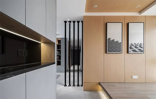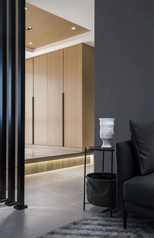 ▲玄關左側是定制鞋柜,右側是抬高的地臺,針對大門的過道裝了一道黑色格柵屏風,使得空間感舒適優雅而又私密。