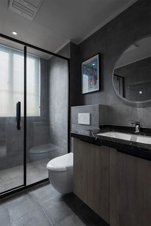 ▲衛生間里面是灰色的地磚與墻磚,,壁掛馬桶后方做了一個小墻臺,裝上灰木色浴室柜+黑色洗手盆,還有圓形的浴室鏡,整個衛浴空間顯得簡約精致而實用時尚。
